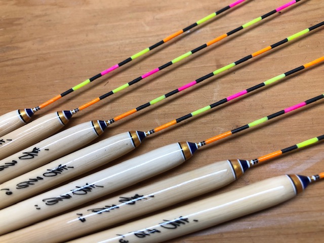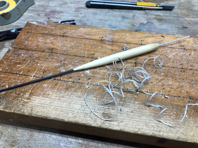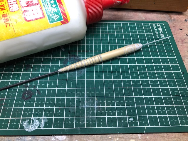 サンドペーパーをかけたボディ素材に足と芯を差し込んでセンターを確認します。良しとなったらボンドをカット面から擦り込むよう注入します。浮子の善し悪しはここで差が出ます。ボディの中綿を必要以上にカットあるいはペーパーをかけ過ぎると、ボディの内部に空洞が出来てしまい、余分なボンドが閉じこもってしまい外見は良くても比重の重い駄目な浮子に必ずなってしまいますので注意が必要です。