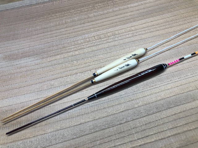 今回は3本でクリア仕上げの浮子はボディを普通より絞り上げている。竹足を長めにしてトップはグラスのロングムク。本当は3本セットだったのですが大きいサイズの絞りが気に入らず却下したので2本となりました。