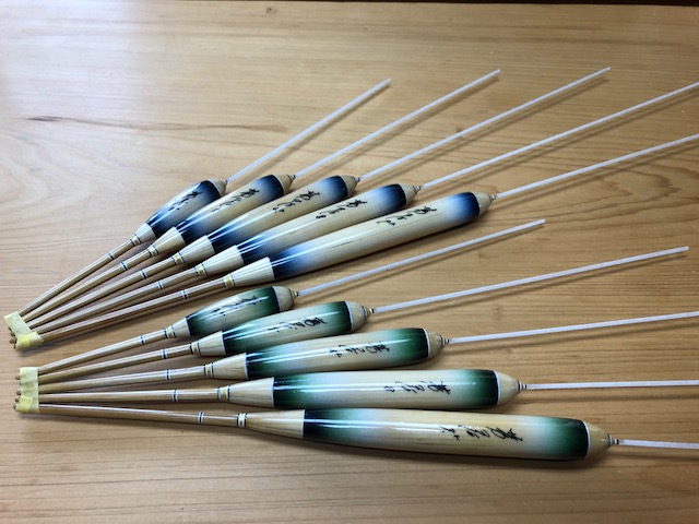 二人のへら浮子はボディ3.5センチから1.5センチ刻みの5本セット。ボディ塗装等はお任せと言うことで、濃紺と濃緑であまり見かけない塗装色としました。あとはトップ塗装で完成です。トップは使ってみて気に入らなければ長さを変更できるので試してください。