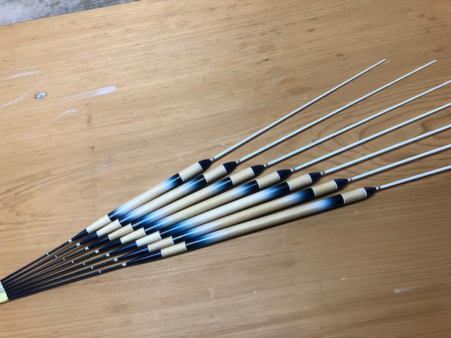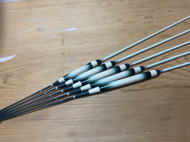 どんな浮子にするか今年はベテランの知り合いや、羽根ではありますが古くからの友人へら浮子制作者との話の中でヒントを得たりしました。今回は3種類で青ボディは7ミリ径の10センチから16センチ。足は1.5ミリ径のテーパーカーボン。トップは中細パイプの15センチから24センチ。