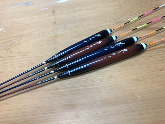 下の4本は自分用の浮子です。ずっと昔に作った浮子ですが、ボディ塗装とトップの塗り替えで蘇らせました♪