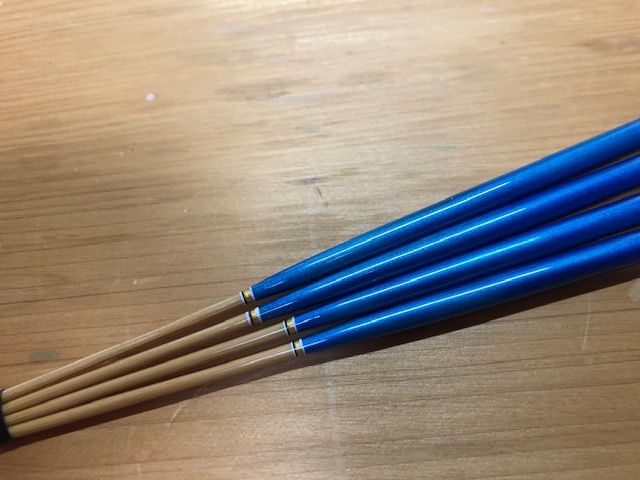 ボディはブルーメタリックで仕上げに残っていたマジョーラで仕上げておりとっても綺麗です♪ボディ径は5.3ミリ径の12.5と13.5センチ。トップはPCハイテク細パイプテーパーの15と18センチ。足は竹足で4.5と5.25センチ。