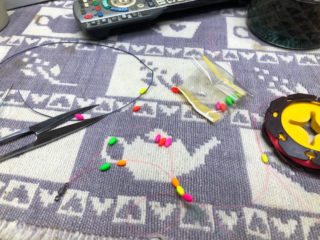 ダクロンの糸に浮子のフロートを取り付けていきます。なんだか歳に似合わず可愛らしくなったけど釣り場で落としても目につきやすいと思っています。![]()